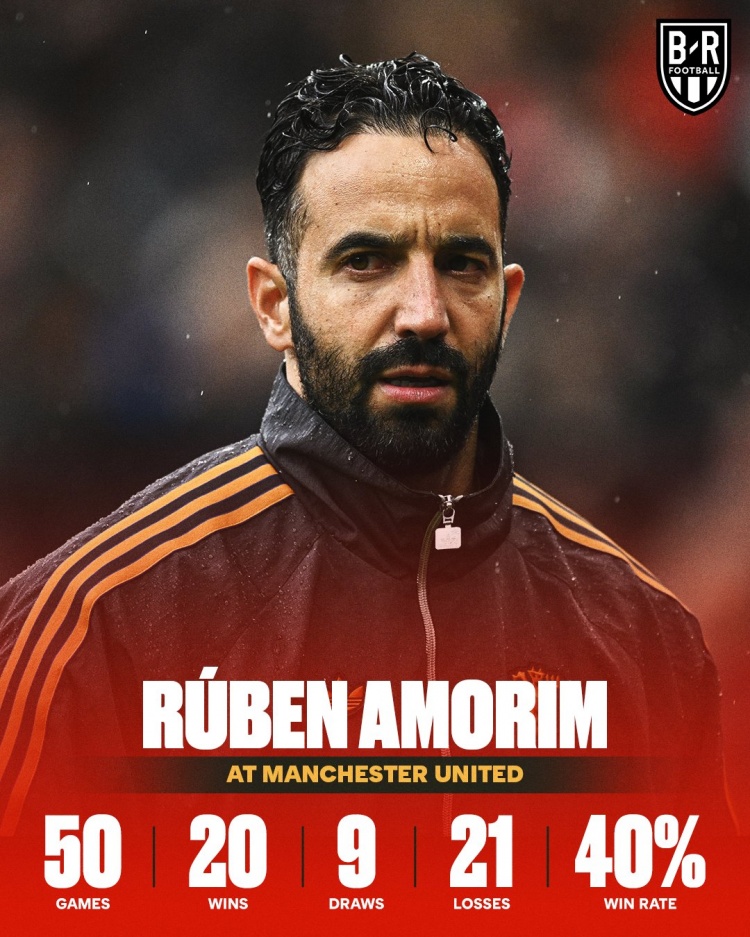 阿莫林持教曼联以来总战绩:50场比赛20胜9平21负,胜率40%
