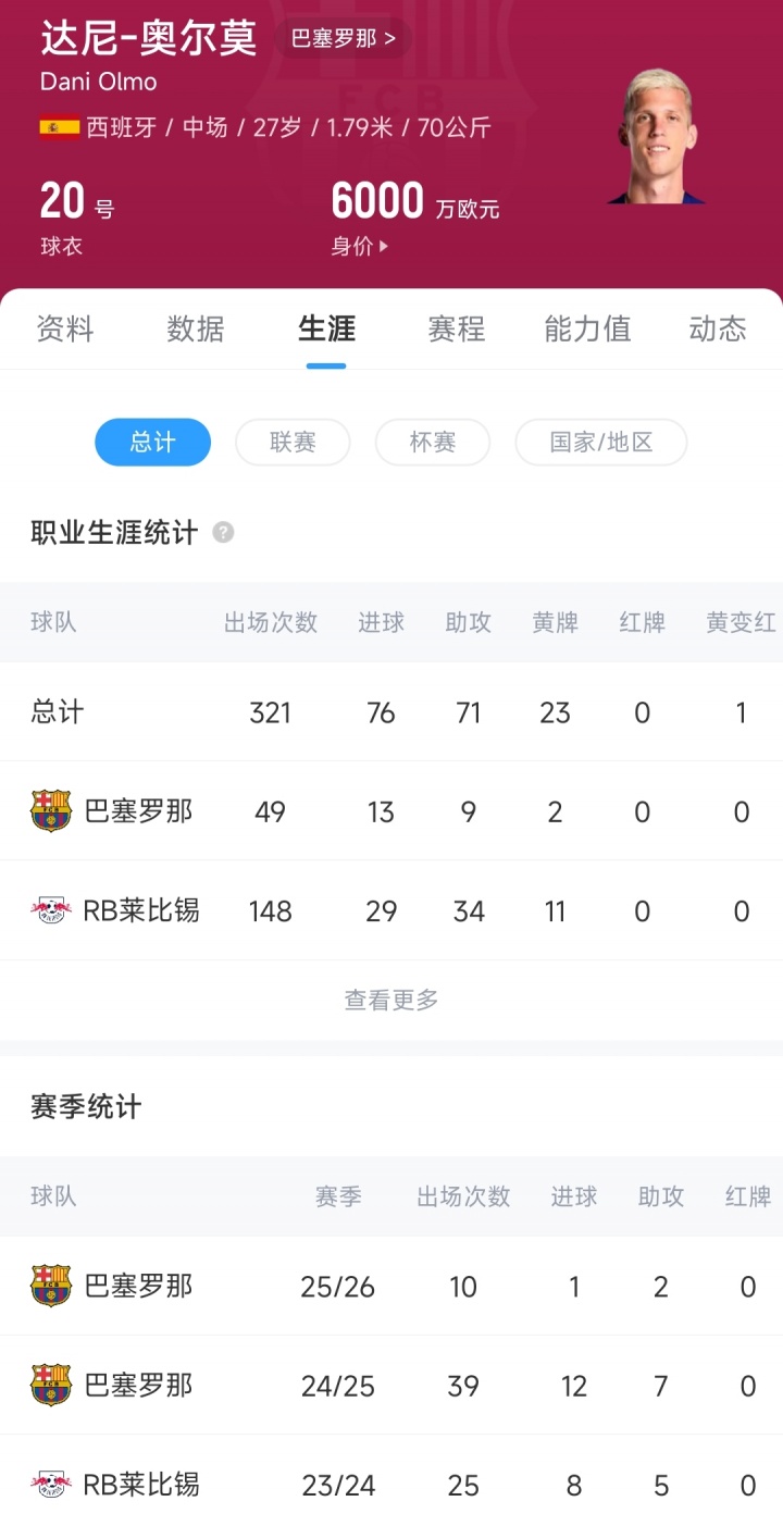 2024年夏窗奥尔莫以5500万欧元的转会费,从RB莱比锡加盟巴萨,首个赛季出战39场比赛孝敬12粒进球和7次助攻,是巴萨西甲夺冠的元勋之一。