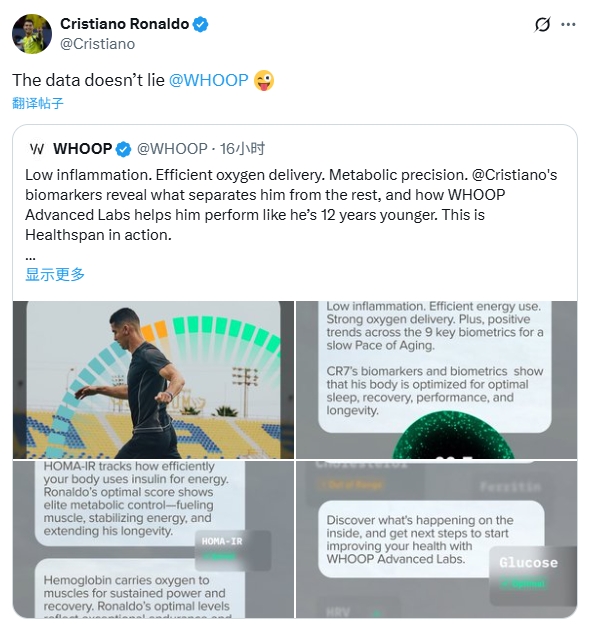 C罗转发并示意:“数据不会说谎@WHOOP😜”