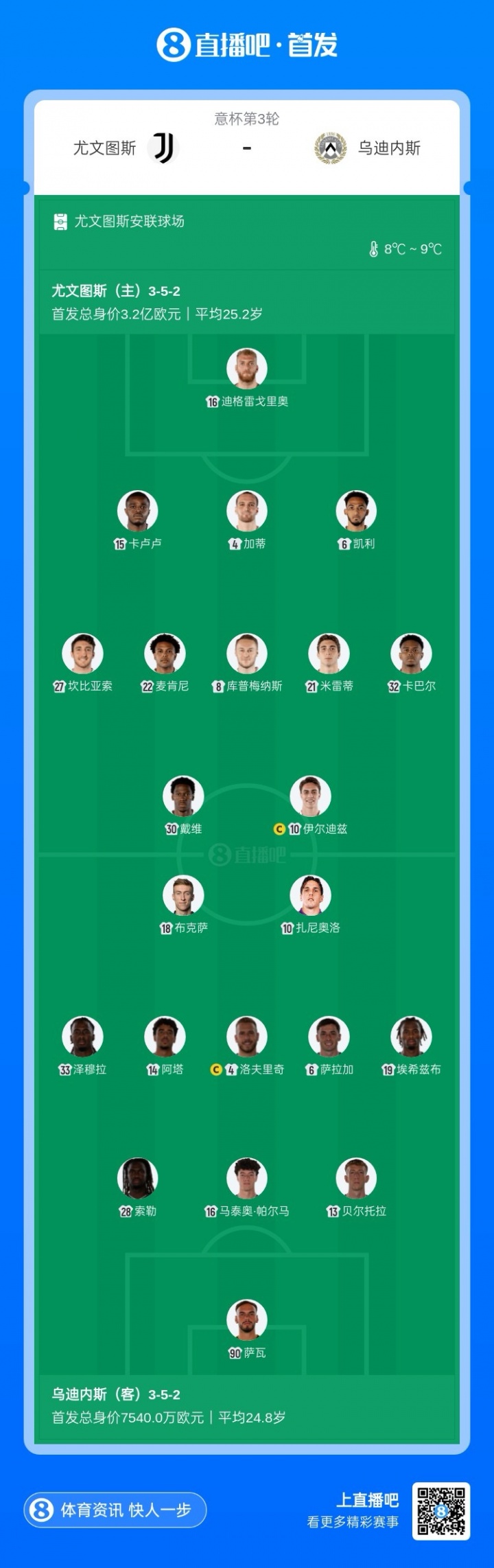 12月3日讯 意杯第3轮,尤文迎战乌迪内斯比赛行将打响。赛前首发出炉。