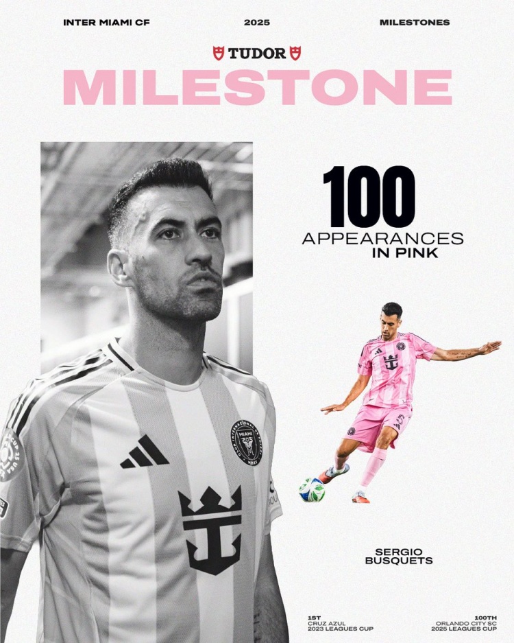 布斯克茨迎来100场里程碑,迈阿密海外官方晒海报道贺