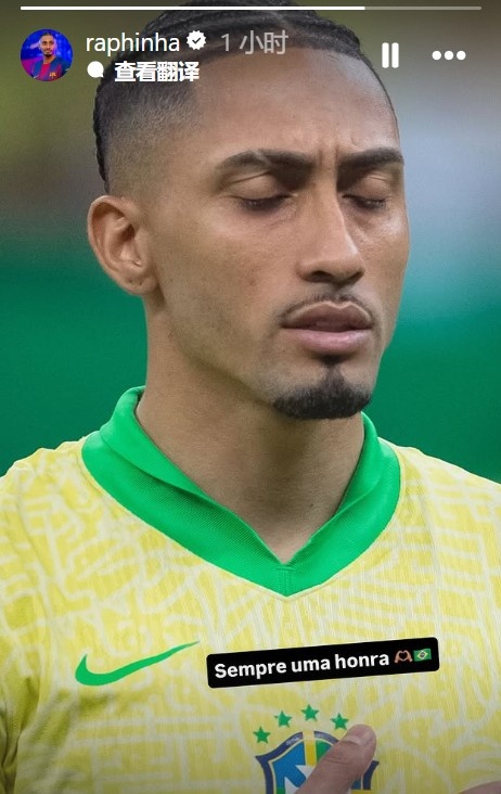拉菲尼亚晒出了身穿巴西队的相片,配文写谈:“遥远齐是一种荣誉。”