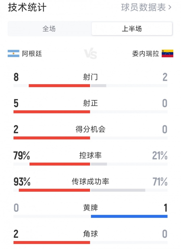 9月5日讯 本轮世初赛阿根廷对阵委内瑞拉上半场放胆,阿根廷凭借梅西进球1-0跨越。以下为两边半场数据对比: