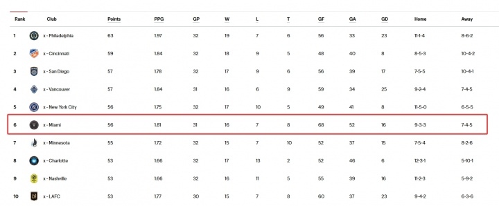 现在好意思职联东西区的老例赛总名次上,费城联32轮63分第一,迈阿密海外31轮56分排在第六。