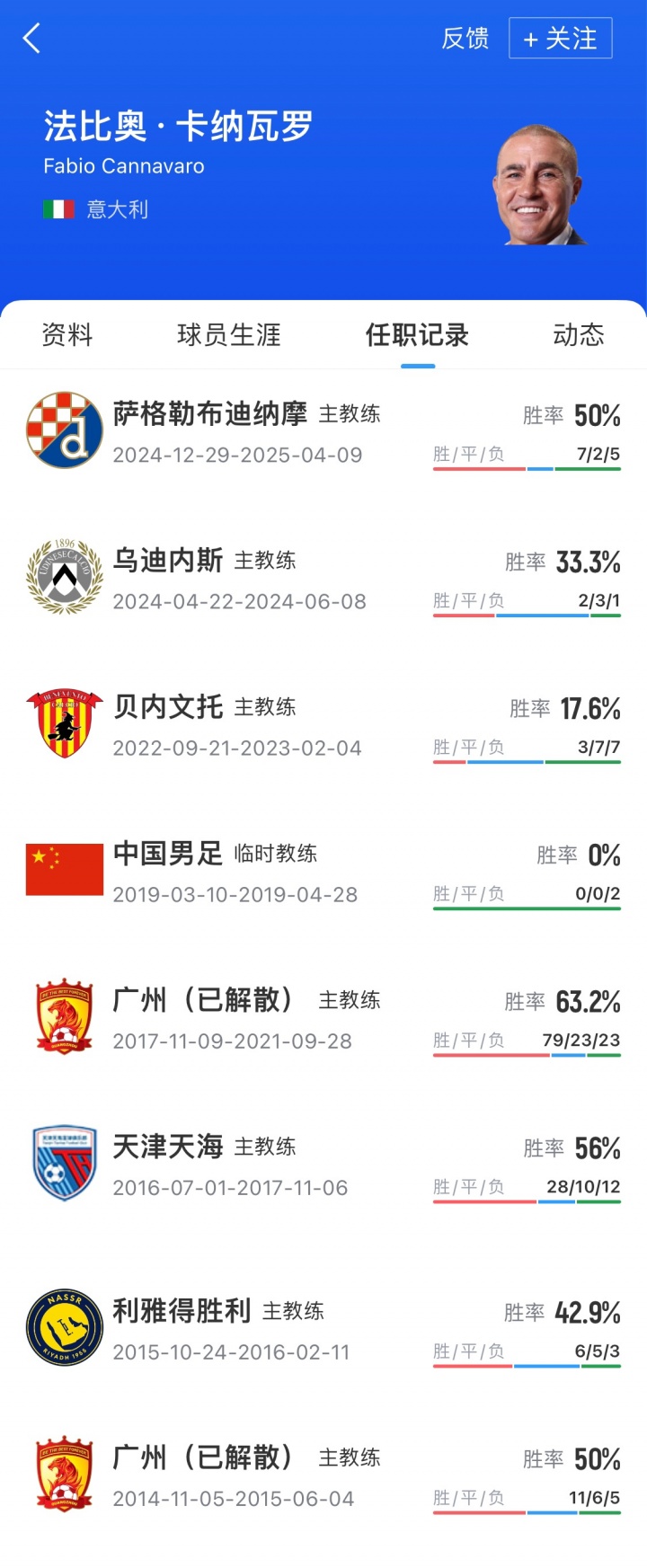 卡纳瓦罗现年52岁,曾捏教广州恒大、利雅得胜利、天津权健、贝内文托、乌迪内斯和萨格勒布迪纳摩。2019年3月-4月,卡纳瓦罗曾出任国足临时主帅,带队树立中国杯,2场比赛均以0-1的比分不敌乌兹别克斯坦和泰国队。