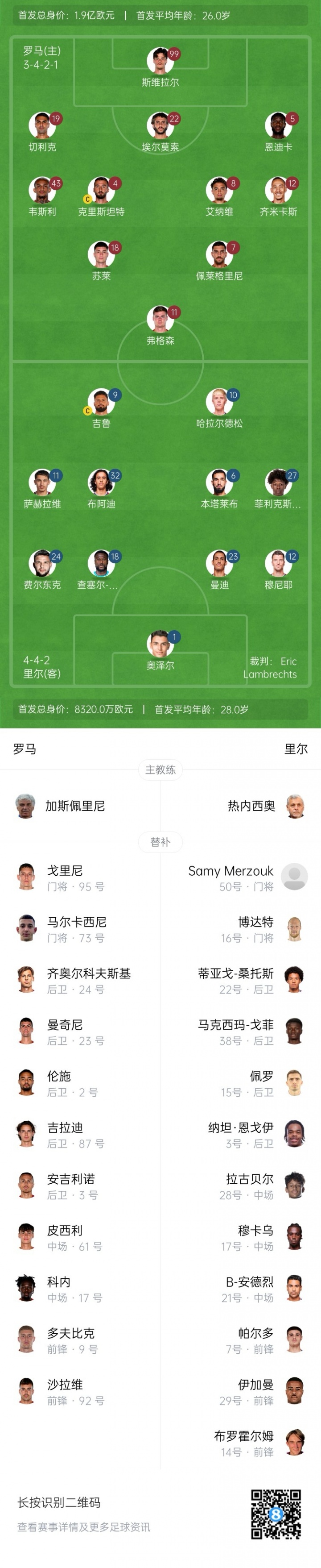 罗马首发:99-斯维拉尔、19-切利克、22-埃尔莫索、5-恩迪卡、43-韦斯利、4-克里斯坦特、8-艾纳维、12-都米卡斯、7-佩莱格里尼、18-苏莱、11-埃文·弗格森