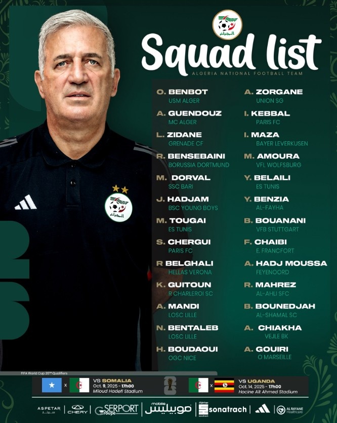 10月2日讯 为了理睬行将到来的对阵索马里和乌干达的比赛,阿尔及利亚公布了新一期的国度队大名单,马赫雷斯、本塞拜尼领衔,都达内之子卢卡入选。
