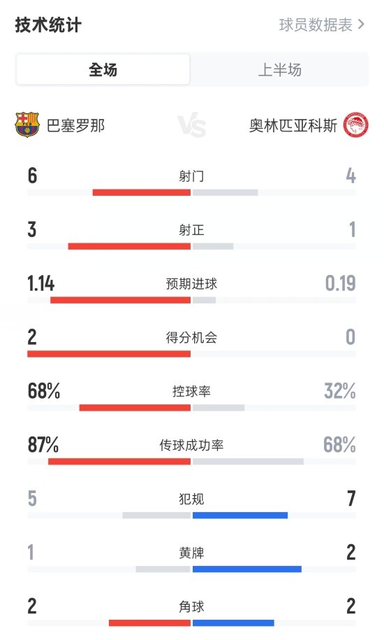巴萨半场2-0奥林匹亚科斯数据:射门6-4,射正3-1,控球率68%-32%