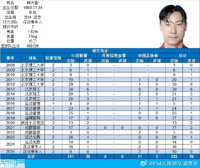 韩光徽现年37岁,曾遵守过北京理工大学、延边富德、淄博蹴鞠、陕西长安竞技、成齐蓉城、延边龙鼎、深圳后生东谈主,共出场322次,打入39球。
