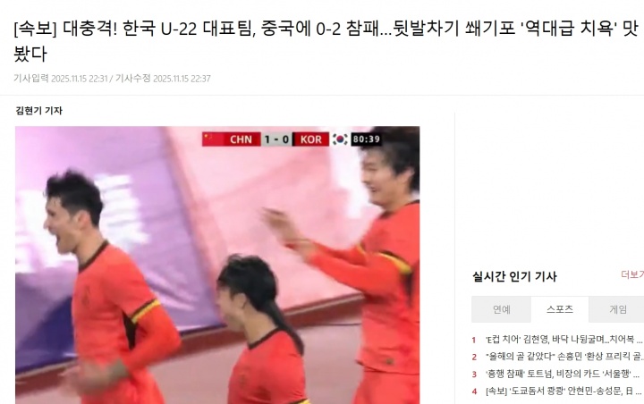 韩媒标题:【突发新闻】畏俱!韩国U22队0-2惨败中国......一记脚后跟破门锁定胜局,这是一场前所未有的羞辱。