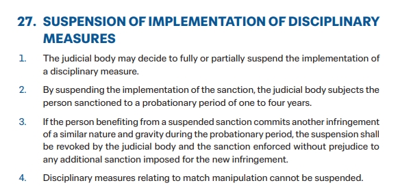 海外足联秩序条例第27条中写说念:对于秩序解决的脱期履行——