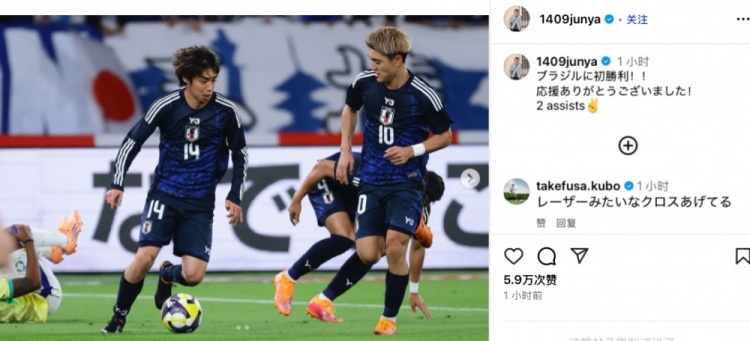 伊东纯也社媒庆祝胜利,久保建英挑剔:你的传中如激光般精确