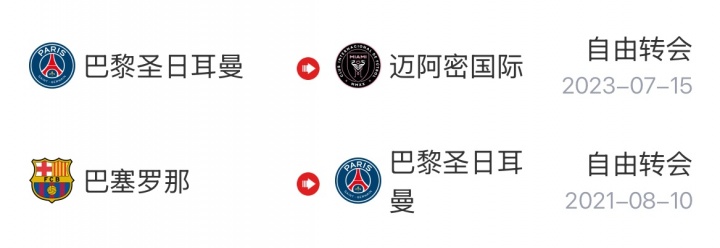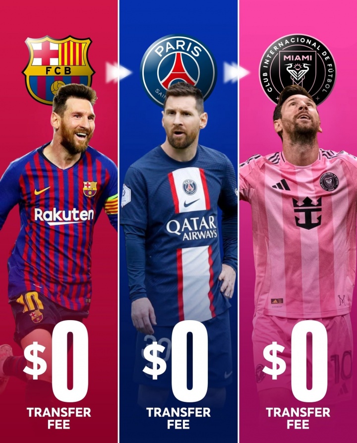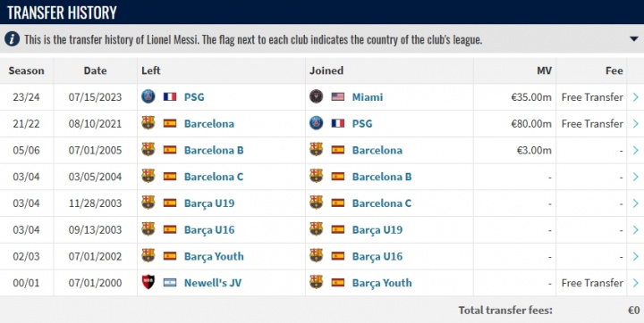 梅西行状生活先后服从巴萨、巴黎以及迈阿密国外三家俱乐部,两次转会梅西均是目田身离队,无转会费。在梅西的德转页面中,他的生活历史转会费总和显著透露为0。