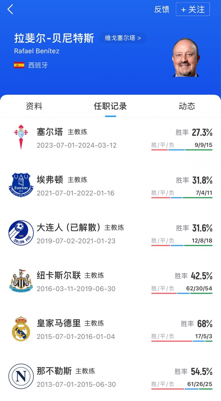贝尼特斯现年65岁,在客岁3月份离开塞尔塔帅位后休闲于今。贝尼特斯此前曾握教过利物浦、国米、切尔西、那不勒斯和皇马等权门,荣誉等身,包括2次西甲冠军、1次欧冠冠军、2次欧联杯冠军和1次世俱杯冠军等。此外贝尼特斯还曾在2019年至2021年担任大连东说念主教化。