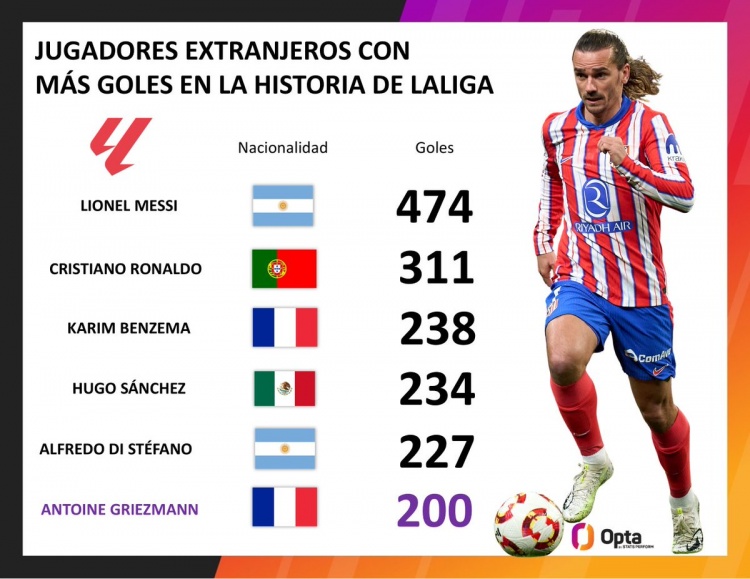 格列兹曼是西甲历史第11位200球先生,同期亦然第6位达此建树的外籍球员。