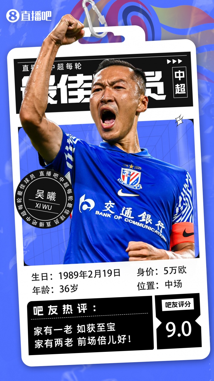 【】中超第26轮最好球员评比成果出炉,上海申花队长吴曦当选!36岁的吴曦梅开二度,指点申花主场6-1打败梅州客家,保握对中超冠军的冲击,这是吴曦本赛季第二次获得中超最好评比!