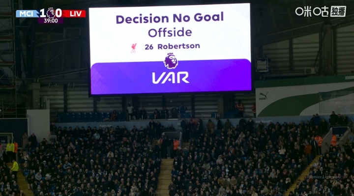 曼城3-0利物浦比赛的第38分钟,范戴克头球破门,但VAR判定罗伯逊越位位置打扰,进球被判无效。利物浦无缘扳平比分。利物浦主帅斯洛特赛后直言,称这一判罚是彰着误判。