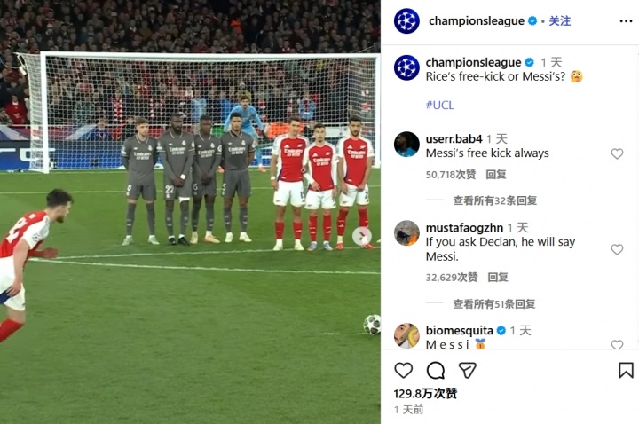 欧冠官方提问说念:赖斯的淘气球还是梅西的? 🤔