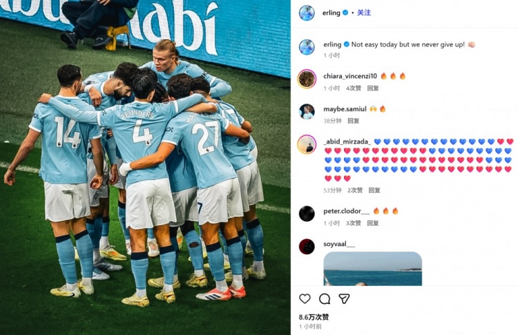哈兰德也在赛后通过社媒晒出全队相拥庆祝照,并配文:“今天并拦阻易,但咱们从不放弃!”