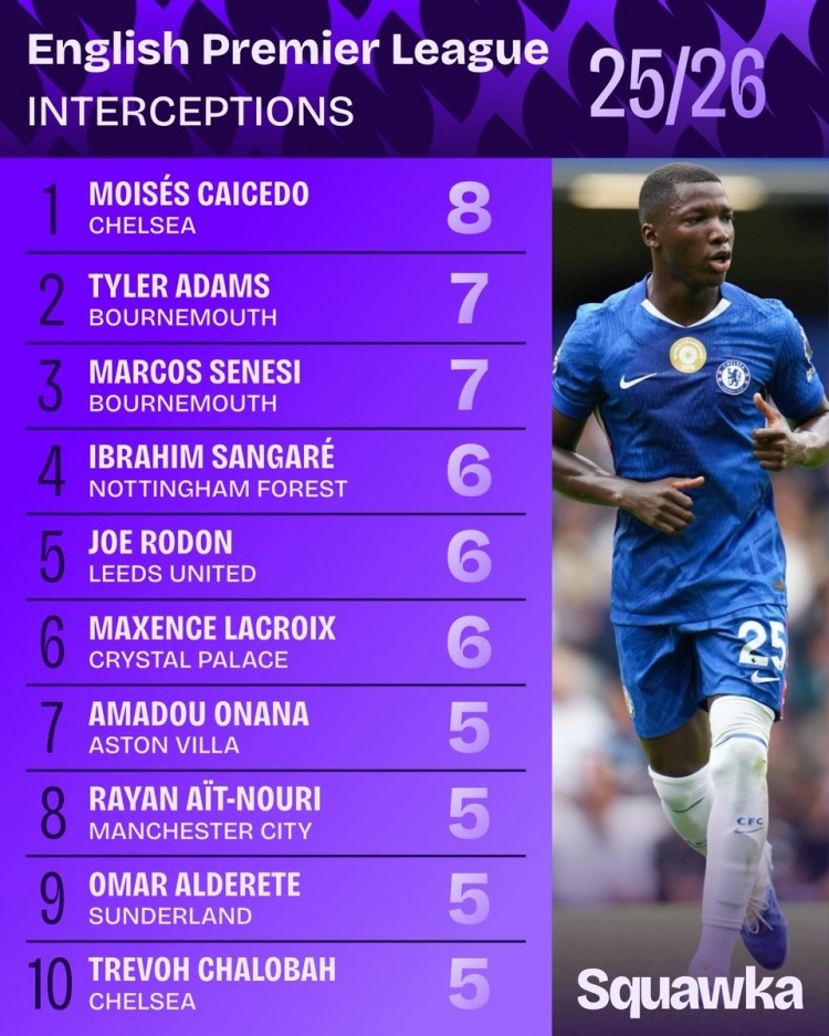 9月3日讯 数据机构squakwa统计了新赛季英超球员收敛情况,凯塞多位列榜首。