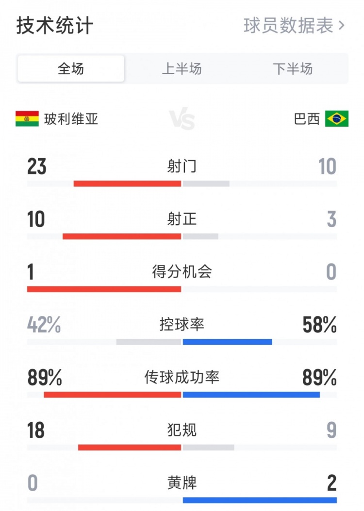 9月10日讯 在本轮南好意思区世初赛,玻利维亚1-0打败巴西,以下为两边全场数据对比: