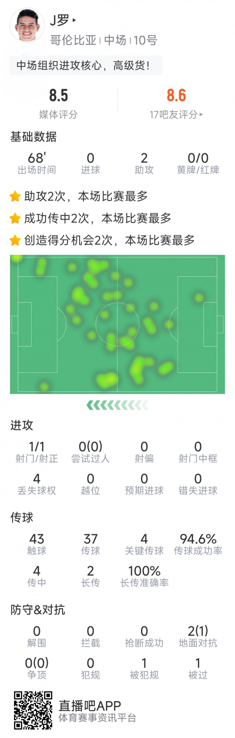 不成替代,J罗本场数据:助攻双响,4次要津传球,1次射正