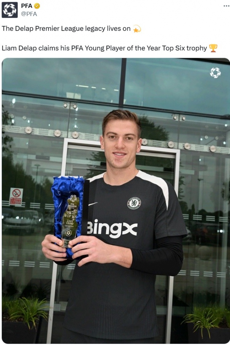 10月7日讯 切尔西球员德拉普此前荣膺PFA年度最好年青球员前6,PFA官推也晒出球员领取奖杯的相片。