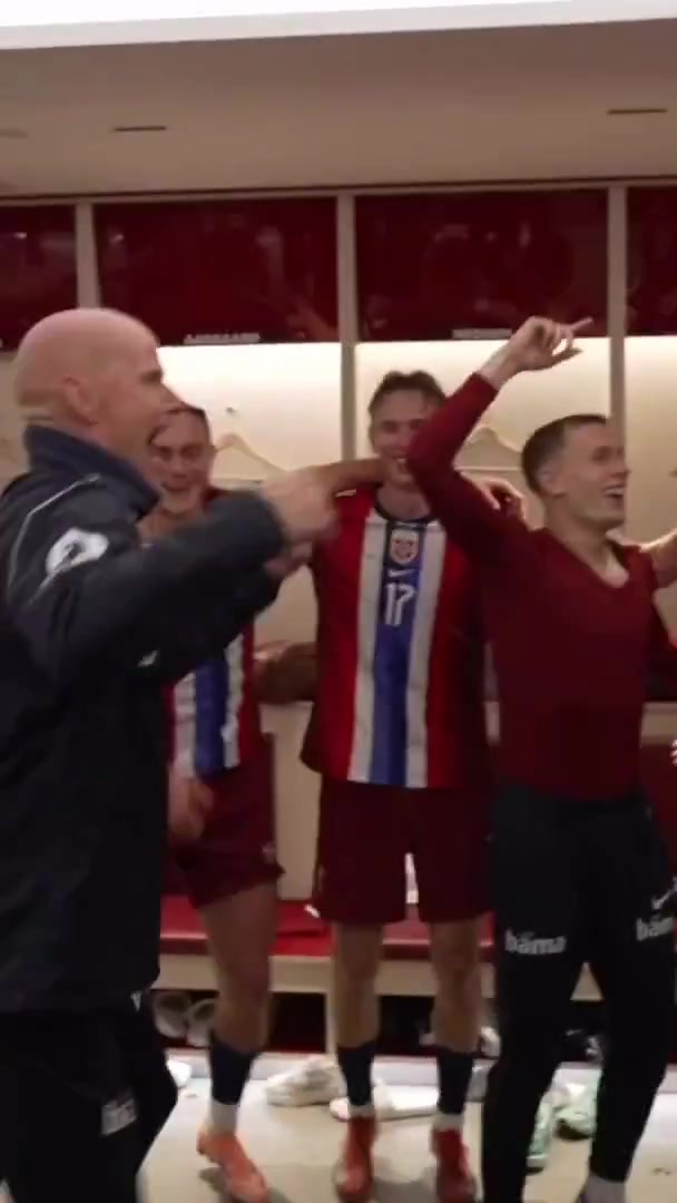 10月12日讯 本轮世初赛挪威5-0狂胜以色列,最快下轮可锁定宇宙杯正赛门票,赛后挪威全队在更衣室率性庆祝,受伤的队长厄德高只可坐在座位上和队友一齐嗨。