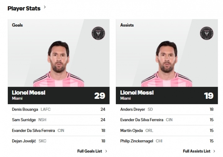 纵情!梅西2025MLS老例赛数据:28场29球19助