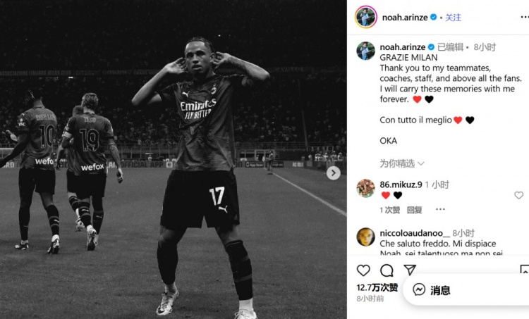 奥卡福写说念:“谢谢米兰!感谢我的队友、锻练、职责主说念主员,尤其感谢球迷们。我将经久真贵这些回忆。❤️🖤”