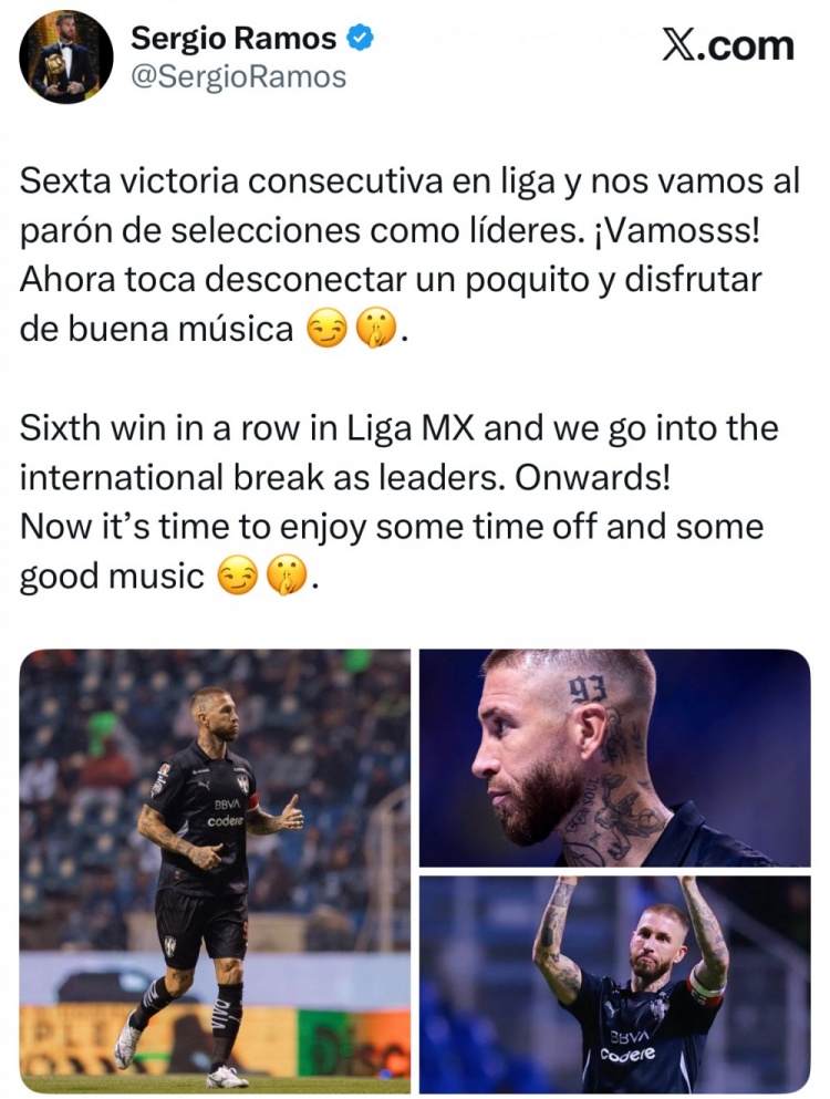助蒙特雷联赛6连胜&榜首,拉莫斯社媒:是时辰裁减裁减,听听音乐